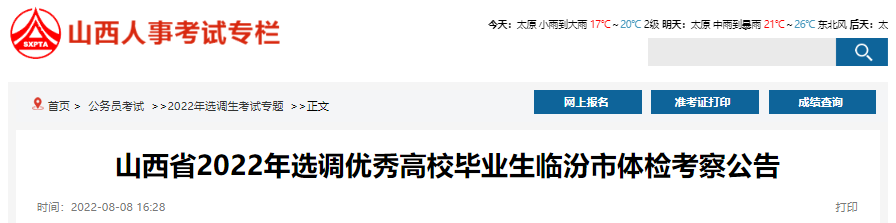 根據(jù)《山西省2022年選調(diào)優(yōu)秀高校畢業(yè)生公告》及公務(wù)員錄用體檢、考察的有關(guān)規(guī)定,現(xiàn)將山西省2022年選調(diào)優(yōu)秀高校畢業(yè)生臨汾市體檢和考察工作有關(guān)事項通知如下: