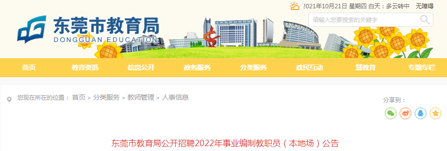 為適應(yīng)東莞市教育事業(yè)發(fā)展需要,保證我局下屬公辦學(xué)校2022年秋季開(kāi)學(xué)教育教學(xué)需求,我局定于2021年11月-12月在東莞本地設(shè)點(diǎn)面向全國(guó)公開(kāi)招聘事業(yè)編制教職員315名。具體事項(xiàng)公告如下: