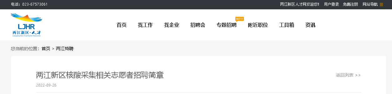 2022重慶兩江新區(qū)核酸采集相關(guān)志愿者招聘200人,詳細請見啟事內(nèi),現(xiàn)將招聘啟事原文發(fā)布如下: