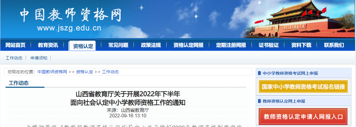 從2022年下半年山西面向社會(huì)認(rèn)定中小學(xué)教師資格工作的通知獲悉,2022年下半年山西面向社會(huì)認(rèn)定中小學(xué)教師資格工作的通知已公布,請(qǐng)相關(guān)人員仔細(xì)閱讀,具體詳情如下: