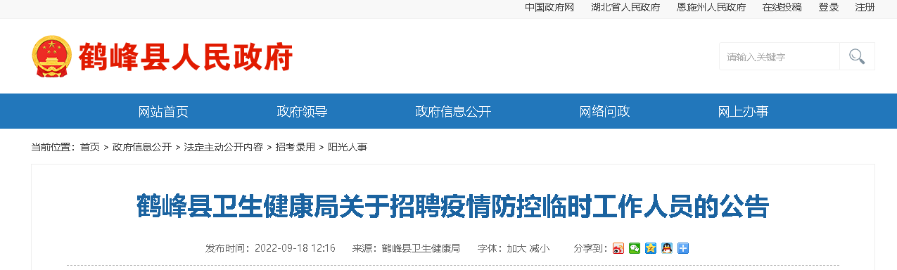 2022湖北恩施州鶴峰縣衛(wèi)生健康局招聘疫情防控臨時工作人員30人,報名時間:2022年9月19日8:30開始,招滿為止,現(xiàn)將招聘公告原文發(fā)布如下: