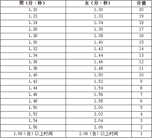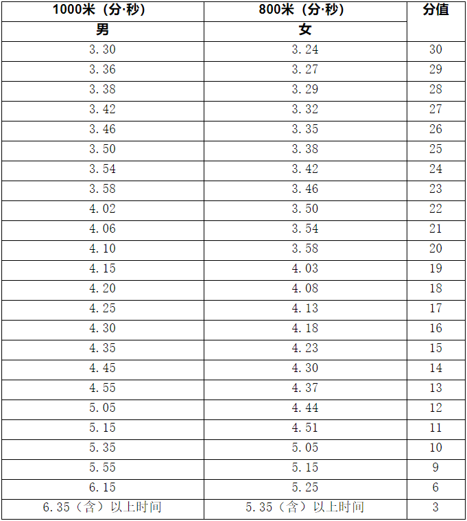 注:1000米、800米跑以分、秒為單位計錄測試成績,精確到1/100秒。