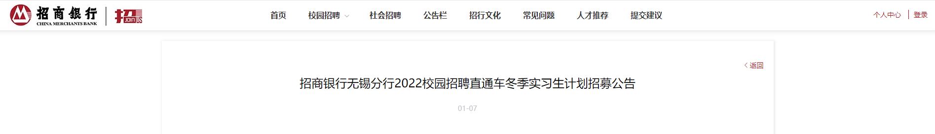 招商銀行無錫分行2022年校園招聘直通車冬季實(shí)習(xí)生計(jì)劃虛位以待,邀您同行!