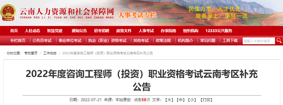 根據(jù)中國(guó)工程咨詢協(xié)會(huì)、人力資源和社會(huì)保障部人事考試中心《關(guān)于做好2022年度咨詢工程師(投資)職業(yè)資格考試工作的補(bǔ)充通知》(中咨協(xié)資信〔2022〕41號(hào))要求,現(xiàn)就2022年度咨詢工程師(投資)職業(yè)資格考試云南考區(qū)有關(guān)事項(xiàng)補(bǔ)充公告如下: