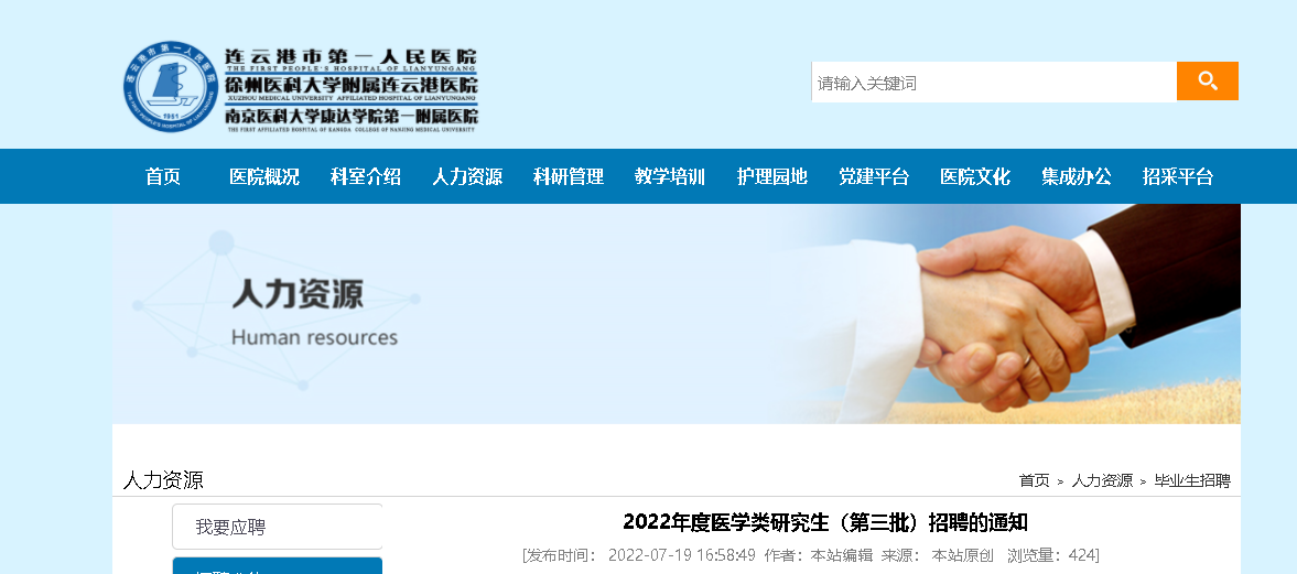 江蘇省連云港市第一人民醫(yī)院是徐淮東部地區(qū)規(guī)模大的三級甲等綜合醫(yī)院和徐州醫(yī)科大學附屬醫(yī)院,南京醫(yī)科大學臨床醫(yī)學院、南京中醫(yī)藥大學中西醫(yī)結合臨床醫(yī)學院、南京醫(yī)科大學康達學院附屬醫(yī)院?,F(xiàn)結合前期崗位招聘情況,現(xiàn)就第三批醫(yī)學類研究生招聘有關事項公告如下: