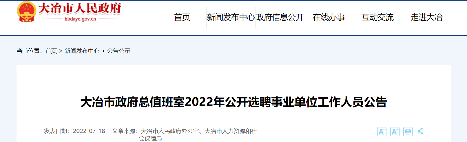2022湖北省黃石市大冶市政府總值班室選聘事業(yè)單位人員公告已發(fā)布。報(bào)名時(shí)間:2022年7月18日—7月22日,推名表可登陸大冶市政府網(wǎng)站(www.hbdaye.gov.cn)公告欄下載?,F(xiàn)將招聘公告原文發(fā)布如下: