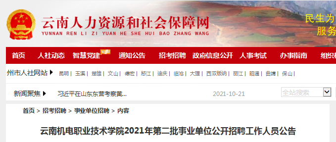2021云南機電職業(yè)技術(shù)學(xué)院第二批事業(yè)單位招聘2人,報名時間:2021年11月1日9:00至11月3日18:00,現(xiàn)將招聘公告原文發(fā)布如下: