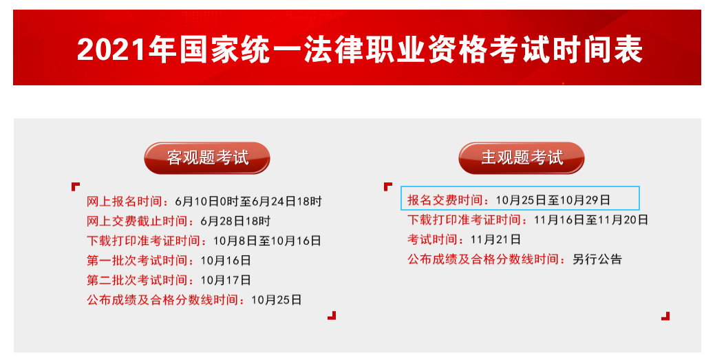 從司法部司法考試中心發(fā)布的《2021年河北法律職業(yè)資格考試時(shí)間確定等相關(guān)事宜的通知》得知,2021年河北法律職業(yè)資格主觀題考試報(bào)名時(shí)間及入口已公布,10月25日起報(bào)名,具體詳情如下:
