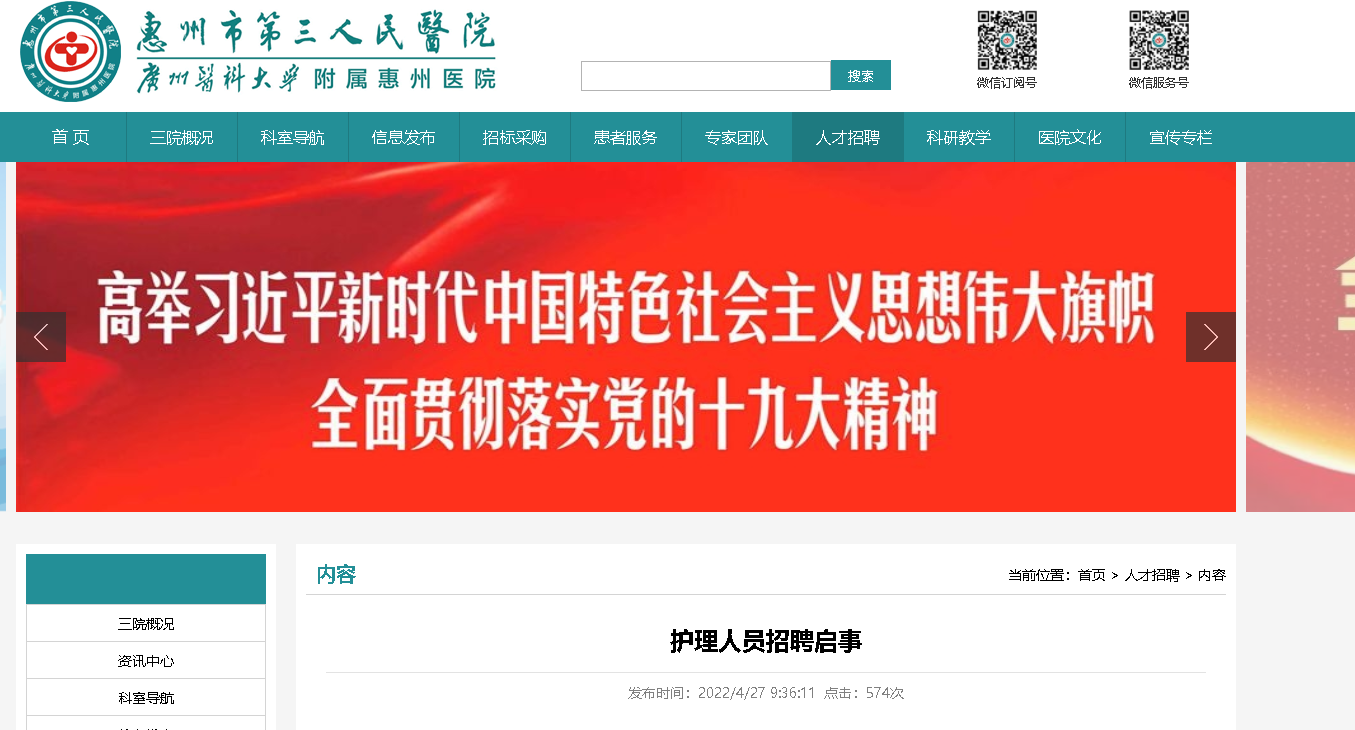 2022廣東惠州市第三人民醫(yī)院招聘護(hù)理人員23人,報(bào)名時(shí)間:2022年4月27日上午9:00—5月7日下午5:00,現(xiàn)將招聘公告原文發(fā)布如下: