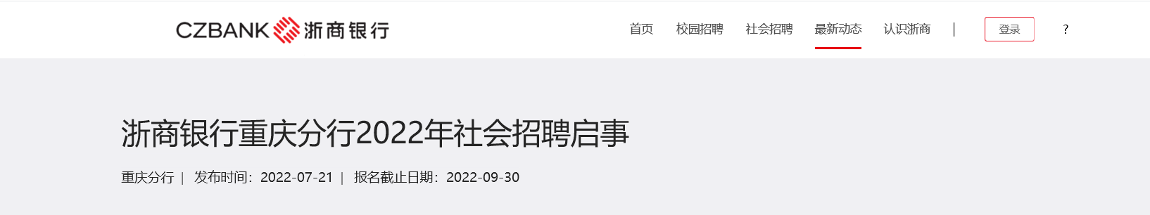 2022年浙商銀行重慶分行社會招聘若干人,簡歷接收時(shí)間:2022年9月30日截止,現(xiàn)將招聘公告發(fā)布如下: