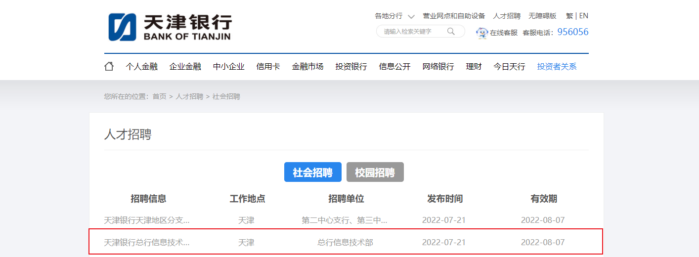 2022天津銀行總行信息技術部招聘若干人,報名時間:2022年7月21至2022年8月7日,現(xiàn)將招聘公告發(fā)布如下: