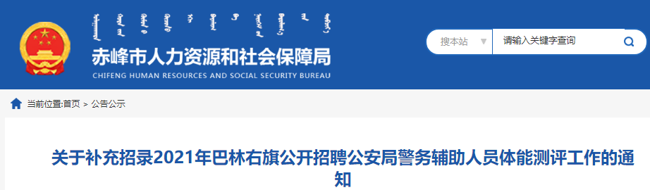 根據(jù)《關(guān)于補(bǔ)充招錄2021年巴林右旗公開招聘公安局警務(wù)輔助人員實(shí)施方案》,將進(jìn)行2021年巴林右旗補(bǔ)充招錄公安局警務(wù)輔助人員體能測(cè)評(píng)工作?,F(xiàn)通知如下: