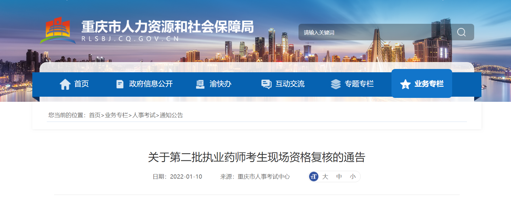 從重慶市人力資源和社會保障局獲悉,2021年重慶第二批執(zhí)業(yè)藥師考生現(xiàn)場資格復(fù)核通告已公布,請相關(guān)人員仔細(xì)閱讀,具體詳情如下: