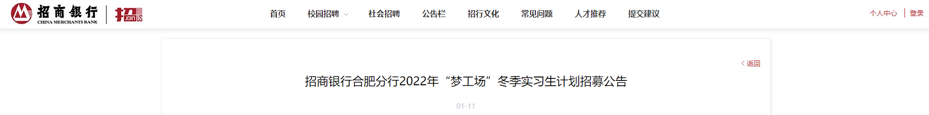 2022招商銀行安徽合肥分行冬季實習生計劃招募若干人,報名時間:2022年1月23日截止,現(xiàn)將招聘公告原文發(fā)布如下:
