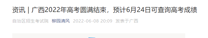 小編根據(jù)廣西招生考試院發(fā)布” 廣西2022年高考圓滿結(jié)束,預(yù)計(jì)6月24日可查詢高考成績(jī)“得知,2022年廣西玉林高考成績(jī)查詢?nèi)肟陬A(yù)計(jì)將于6月24日開(kāi)通,考生可關(guān)注廣西招生考試院、官方微信公眾號(hào)“柳園清風(fēng)”進(jìn)行高考查分,祝大家高考取得優(yōu)異成績(jī)!