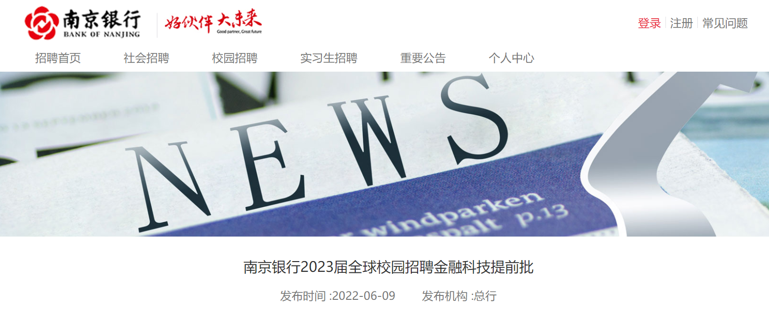2023屆江蘇省南京銀行全球校園招聘金融科技提前批公告【130人】已發(fā)布, 報(bào)名時(shí)間:即日起-2022年7月10日。為了方便考生報(bào)考,現(xiàn)將相關(guān)信息發(fā)布如下: