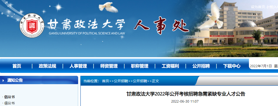 2022年甘肅政法大學(xué)公開考核招聘急需緊缺專業(yè)人才公告已發(fā)布,報名時間:公告發(fā)布之日起至2022年7月10日,現(xiàn)將招聘公告原文發(fā)布如下: