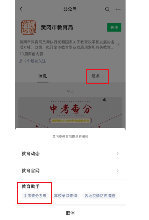 點(diǎn)擊進(jìn)入>>>2022年湖北黃岡中考成績(jī)查詢?nèi)肟诙?BR> 2.公眾號(hào)查詢?nèi)肟?/strong>