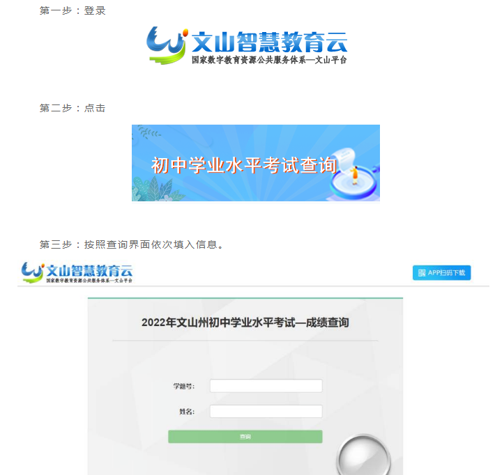 方式二:手機(jī)登錄文山智慧教育云App,或掃描下方二維碼登錄,點(diǎn)擊“初中學(xué)業(yè)水平考試成績(jī)查詢”模塊,輸入學(xué)籍號(hào)和姓名,進(jìn)行查詢。