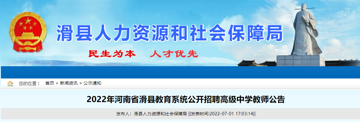 2022年7月1日,在滑縣人力資源和社會(huì)保障局網(wǎng)站(http://hahuaxian.hrss.gov.cn/)發(fā)布招聘信息。本次招聘工作有關(guān)的信息和事項(xiàng)均通過(guò)該網(wǎng)站發(fā)布,請(qǐng)應(yīng)聘者主動(dòng)登錄查詢,不再另行通知。