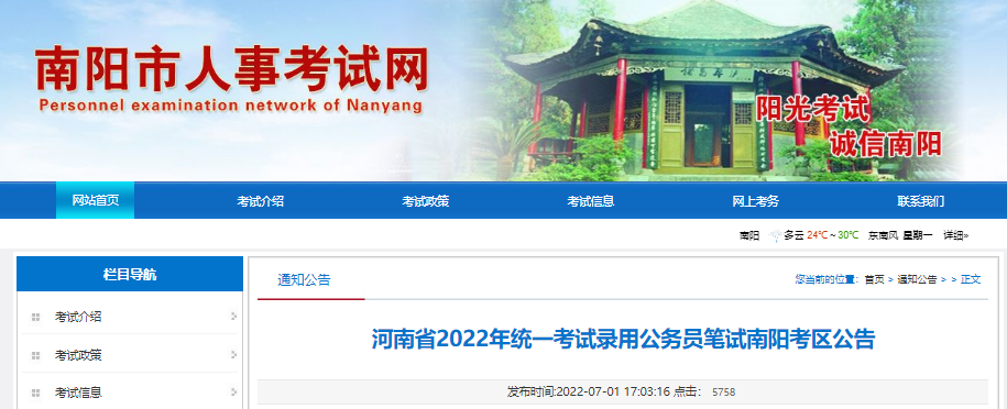 河南省2022年統(tǒng)一考試錄用公務員筆試將于7月9日、10日舉行。為確保考生“應考盡考”、順利參考,現(xiàn)將南陽考區(qū)有關事宜公告如下:
