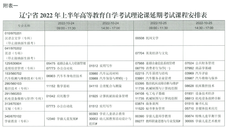 受新冠肺炎疫情影響,遼寧朝陽2022年上半年理論課延期考試時間為10月24日、25日,遼寧朝陽2022年下半年理論課考試時間為10月22日、23日,上半年延期考試各專業(yè)考試課程和時間安排詳見附表一,下半年各專業(yè)考試課程和時間安排詳見附表二。2022年下半年實踐環(huán)節(jié)考核和論文答辯的時間由各主考學(xué)校確定,各專業(yè)實踐環(huán)節(jié)考核課程及時間安排詳見附表三。