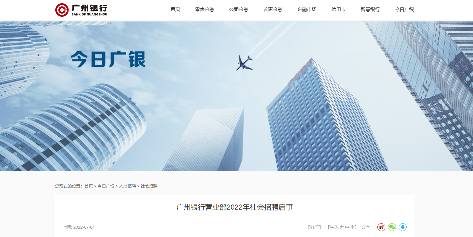 官方微信:關(guān)注“廣州銀行招聘”微信公眾號,點擊“社會招聘”,查看廣州銀行營業(yè)部招聘職位并投遞簡歷。
