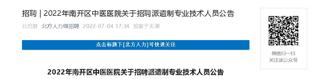 2022天津南開區(qū)中醫(yī)醫(yī)院招聘派遣制專業(yè)技術(shù)人員20人,報名時間:2022年7月4日18:00—7月11日18:00,現(xiàn)將招聘公告原文發(fā)布如下: