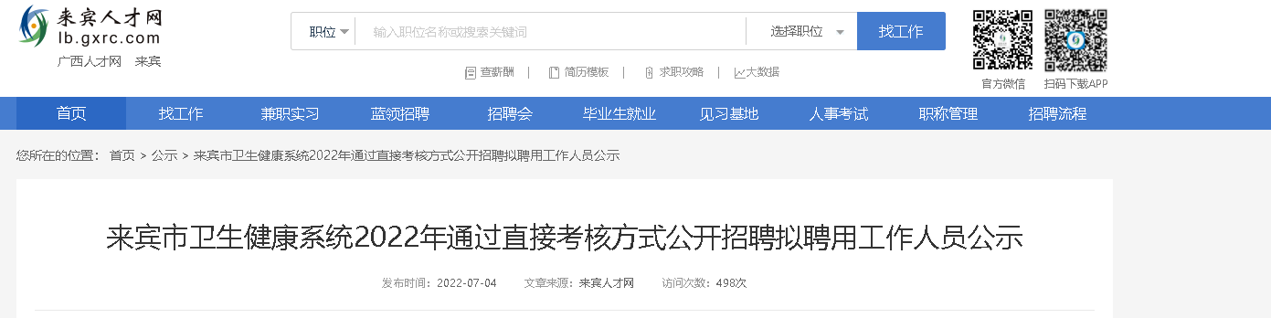 2022廣西來賓市衛(wèi)生健康系統(tǒng)通過直接考核方式招聘擬聘用工作人員公示已出,公示時(shí)間:2022年7月4日至7月10日,現(xiàn)將招聘公示原文發(fā)布如下: