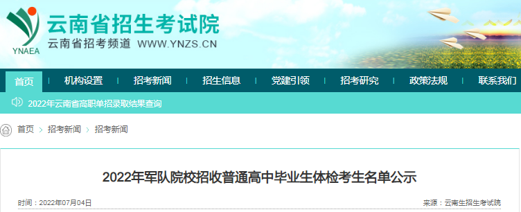 從云南省招生考試院了解到,云南2022年軍隊院校招收普通高中畢業(yè)生體檢考生名單公示已發(fā)布,詳細內(nèi)容如下: