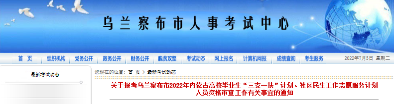 2022年內(nèi)蒙古高校畢業(yè)生“三支一扶”、社區(qū)民生工作志愿服務(wù)計劃錄取人員名單于7月4日在內(nèi)蒙古人事考試和培訓(xùn)網(wǎng)公布,現(xiàn)將報考烏蘭察布市2022年內(nèi)蒙古高校畢業(yè)生“三支一扶”計劃、社區(qū)民生工作志愿服務(wù)計劃人員資格審查工作有關(guān)事宜通知如下: