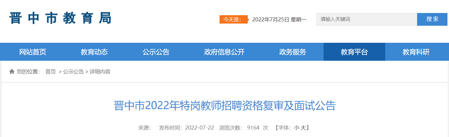 2022年山西晉中市特崗教師招聘資格復(fù)審及面試公告已發(fā)布,資格復(fù)審時間:2022年7月26日上午8:30—12:00?,F(xiàn)將原文發(fā)布如下: