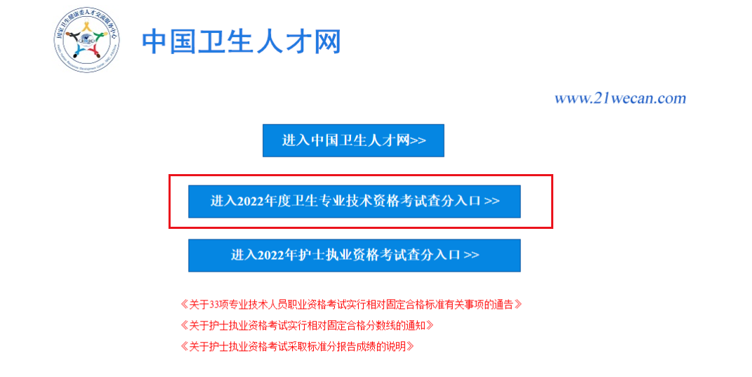 01、登錄“中國衛(wèi)生人才網(wǎng)”網(wǎng)站,點(diǎn)擊“進(jìn)入2022年度衛(wèi)生專業(yè)技術(shù)資格考試查分入口”。