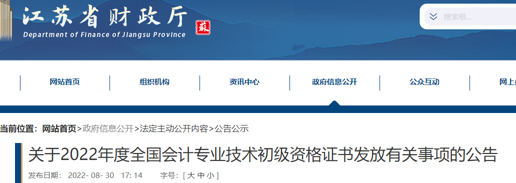 小編根據(jù)江蘇省財政廳發(fā)布”關(guān)于2022年度全國會計專業(yè)技術(shù)初級資格證書發(fā)放有關(guān)事項的公告“得知,2022年江蘇初級會計職稱成績合格的考生可于9月24日后登錄江蘇會計考試(http://kjexam.jsczt.cn)查看本人資格審核結(jié)果。