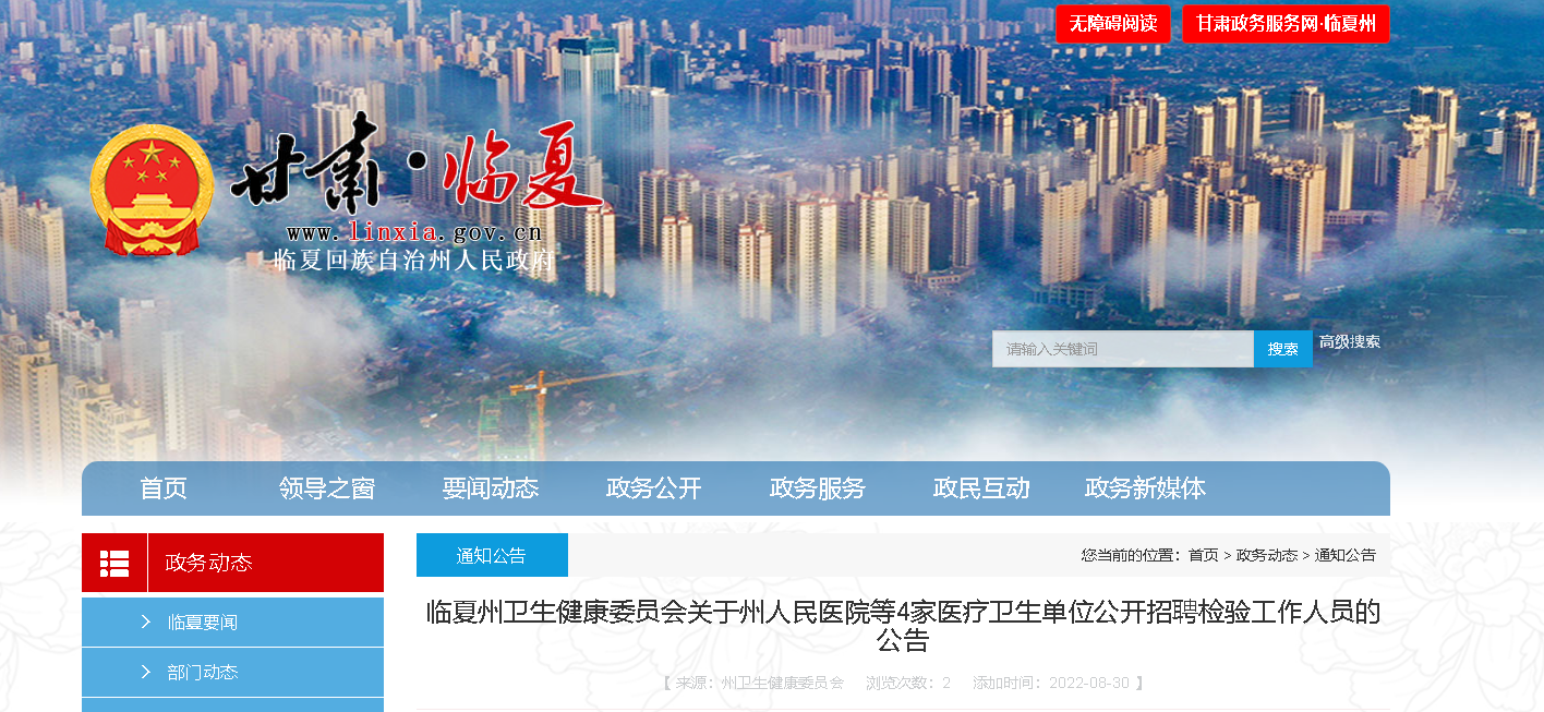 原文標題:臨夏州衛(wèi)生健康委員會關于州人民醫(yī)院等4家醫(yī)療衛(wèi)生單位公開招聘檢驗工作人員的公告