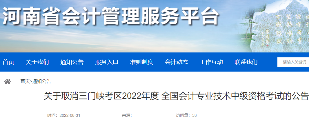原標(biāo)題:關(guān)于取消三門峽考區(qū)2022年度全國會(huì)計(jì)專業(yè)技術(shù)中級(jí)資格考試的公告