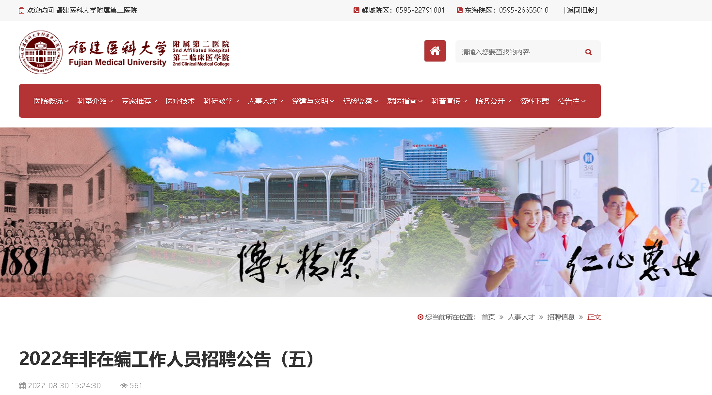 2022年福建醫(yī)科大學(xué)附屬第二醫(yī)院非在編工作人員招聘5人(五),報(bào)名時(shí)間:2022年8月30日至2022年9月8日,現(xiàn)將招聘公告原文發(fā)布如下: