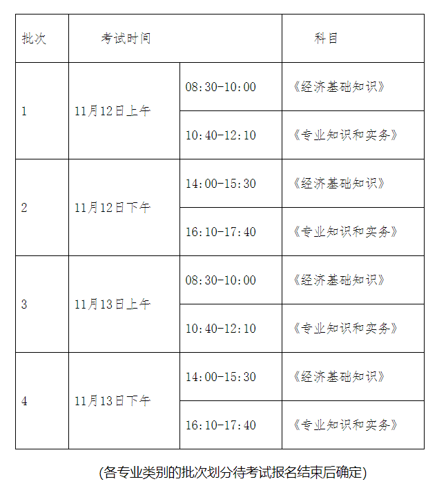 初級、中級考試均設(shè)公共科目《經(jīng)濟(jì)基礎(chǔ)知識(shí)》和專業(yè)科目《專業(yè)知識(shí)和實(shí)務(wù)》,題型均為客觀題。初中級考試分2天上、下午4個(gè)批次實(shí)施。各級別及專業(yè)類別的具體考試時(shí)間和批次劃分,視報(bào)名情況另行確定。具體考試時(shí)間安排見下表: