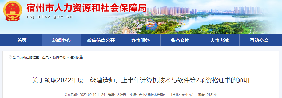 二、線上審核通過的2022年度二級(jí)建造師、上半年計(jì)算機(jī)技術(shù)與軟件等2項(xiàng)資格考試合格人員,可通過省政務(wù)服務(wù)網(wǎng)和“皖事通”APP在線申請(qǐng)證書免費(fèi)郵寄,也可攜帶本人有效身份證(非本人領(lǐng)取請(qǐng)攜帶考生本人身份證)至宿州市高新區(qū)埇上路566號(hào)宿州市政務(wù)服務(wù)大廳4樓人社局窗口領(lǐng)取資格證書。