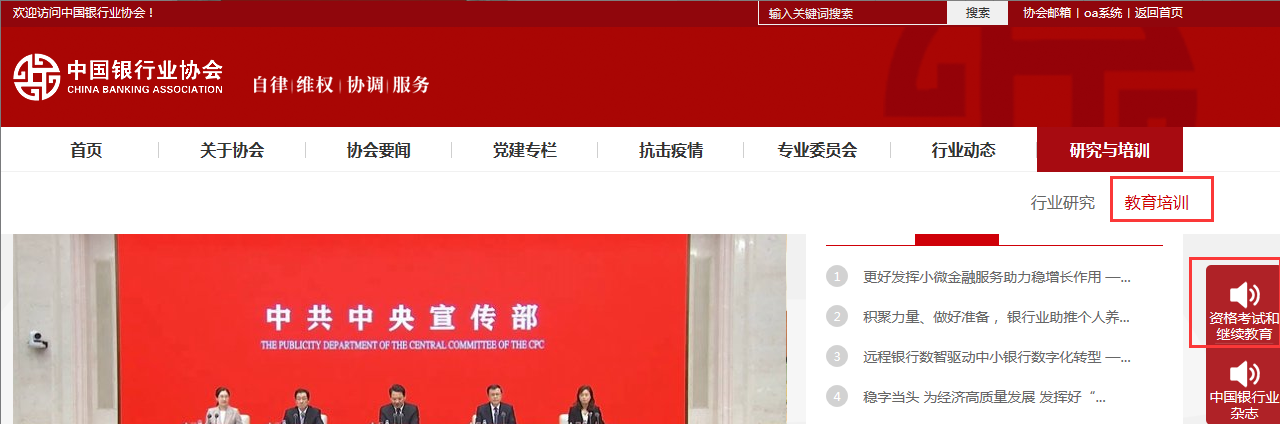 第一步:登陸中國(guó)銀行業(yè)協(xié)會(huì),點(diǎn)擊右側(cè)“資格考試和繼續(xù)教育”。如圖: