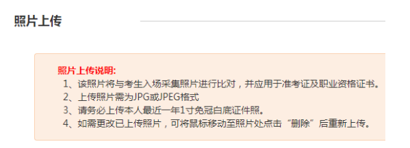 報(bào)名時(shí)均須上傳本人最近一年1寸免冠白底證件照,請(qǐng)?zhí)崆皽?zhǔn)備照片(標(biāo)準(zhǔn)證件數(shù)字照片,文件格式為JPG或JPEG格式,白色背景,尺寸25mm*35mm,像素>=295*413),該照片將用于準(zhǔn)考證及職業(yè)資格證書(請(qǐng)勿上傳過(guò)度修飾或美化的照片,因照片不符合要求所造成的后果由考生自行承擔(dān))。