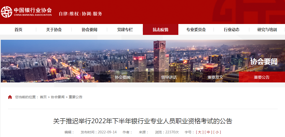 原文標(biāo)題:關(guān)于推遲舉行2022年下半年銀行業(yè)專業(yè)人員職業(yè)資格考試的公告