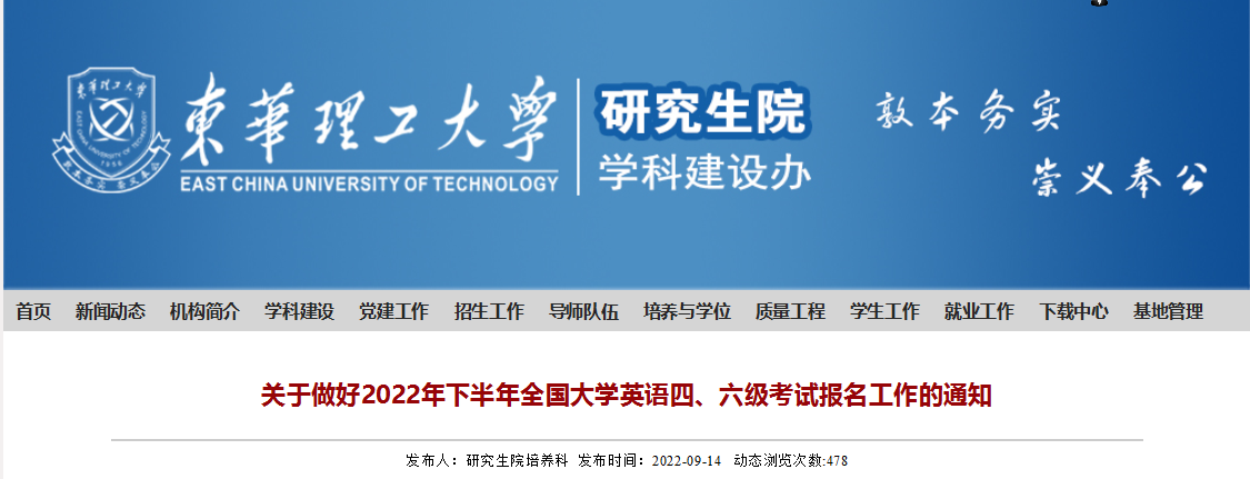 從東華理工大學(xué)研究生院獲悉,2022年下半年江西東華理工大學(xué)英語四、六級考試報名工作的通知已公布,報名時間9月20日-9月30日,具體詳情如下: