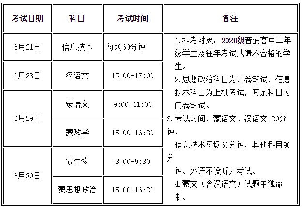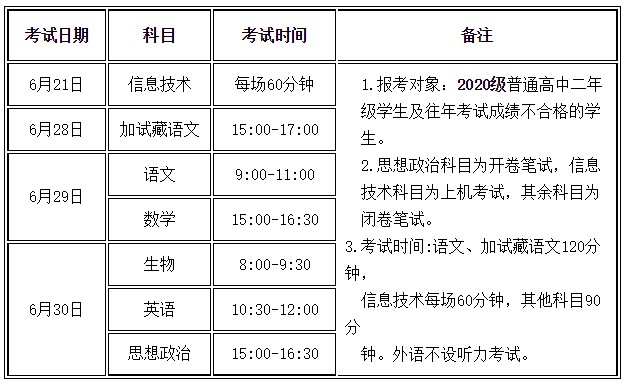 適用舊版教材的夏季普通高中學(xué)業(yè)水平考試信息技術(shù)機(jī)試時間為6月21日,文化科目筆試時間為6月29日至30日(6月28日為少數(shù)民族語言加試科目考試時間);適用新版教材的合格性考試文化科目筆試時間為7月1日。