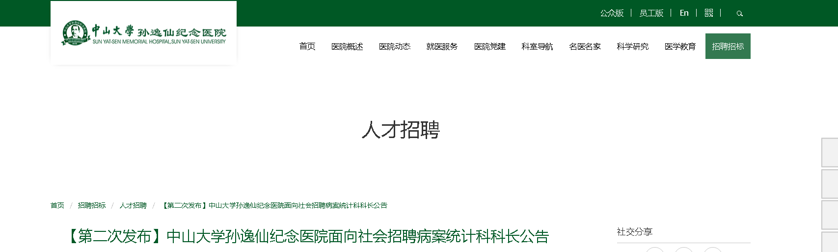 廣東中山大學(xué)孫逸仙紀(jì)念醫(yī)院面向社會(huì)招聘病案統(tǒng)計(jì)科科長,報(bào)名時(shí)間:2022年1月18日截止,現(xiàn)將招聘公告原文發(fā)布如下: