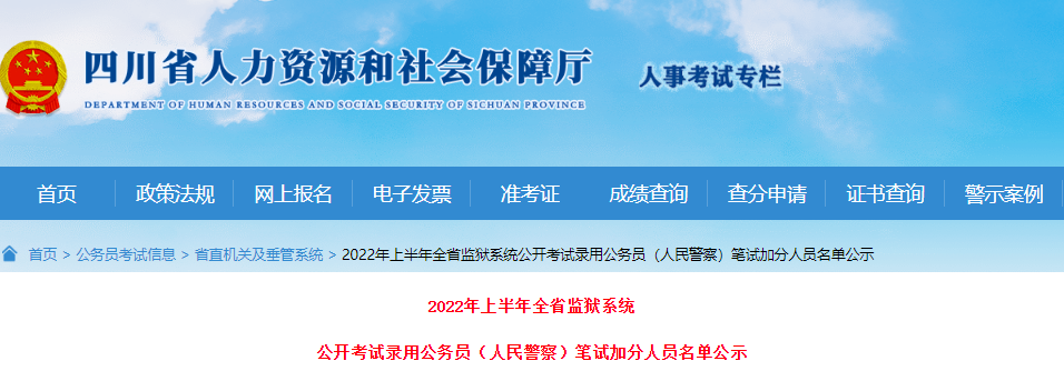 2022年上半年四川省監(jiān)獄系統(tǒng)公開考試錄用人民警察筆試加分人員公示已公布,為了方便廣大考生的查閱,下面為您詳細(xì)介紹一下本次招錄人民警察筆試加分人員公示的具體事宜,希望廣大考生及時關(guān)注,如有相關(guān)疑問,請關(guān)注招警考試頻道為您實(shí)時做出的更新。