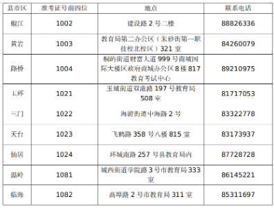 申請(qǐng)免考考生應(yīng)在網(wǎng)上登記前完成浙江省“健康碼”的申領(lǐng)(可通過(guò)“浙里辦”APP或支付寶辦理)。到現(xiàn)場(chǎng)提交材料的考生均須自備性醫(yī)用口罩或醫(yī)用外科口罩,但不得因?yàn)榕宕骺谡钟绊懮矸葑R(shí)別??忌诂F(xiàn)場(chǎng)申請(qǐng)辦理免考過(guò)程中,須遵守考試機(jī)構(gòu)及所在地疫情防控部門關(guān)于疫情防控的規(guī)定,積極配合進(jìn)行健康檢查和登記,如遇突發(fā)情況須聽(tīng)從考試機(jī)構(gòu)安排。具體防疫要求請(qǐng)咨詢相關(guān)縣市區(qū)考試機(jī)構(gòu)。各縣市區(qū)考試機(jī)構(gòu)申辦地址及聯(lián)系方式見(jiàn)下表: