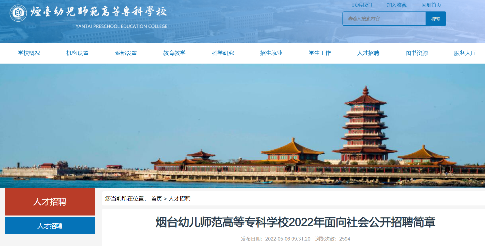 2022山東煙臺(tái)幼兒師范高等??茖W(xué)校面向社會(huì)招聘簡(jiǎn)章已發(fā)布,報(bào)名時(shí)間:自簡(jiǎn)章發(fā)布之日起至2022年6月13日下午17:00,現(xiàn)將招聘公告原文發(fā)布如下: