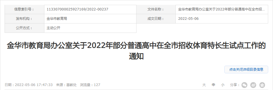 從金華市教育局了解到,關(guān)于浙江金華2022年部分普通高中在全市招收體育特長(zhǎng)生試點(diǎn)工作的通知已發(fā)布,詳細(xì)內(nèi)容如下: