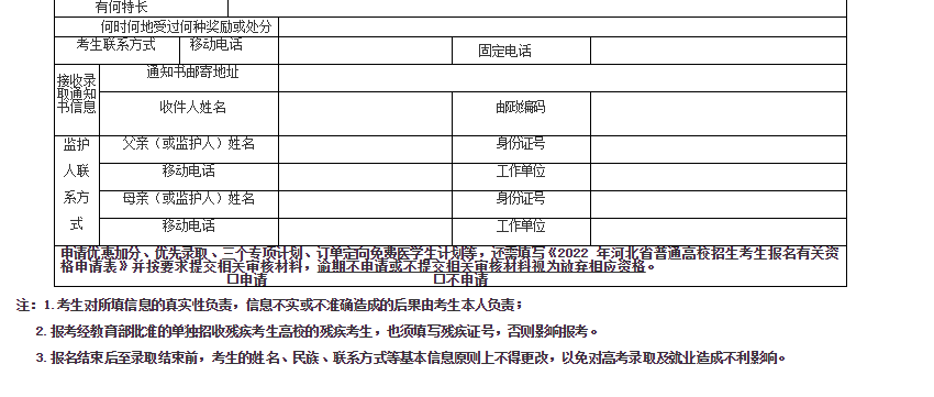 9、殘疾證號(hào)項(xiàng):殘疾考生要填寫(xiě)殘疾證號(hào)和殘疾類(lèi)別,申請(qǐng)享受2022年高考合理便利的殘疾考生還須按報(bào)名點(diǎn)要求,如實(shí)填寫(xiě)《殘疾人報(bào)考河北省普通高等學(xué)校招生全國(guó)統(tǒng)一考試合理便利申請(qǐng)表》,非殘疾考生不填寫(xiě)殘疾證號(hào)和殘疾類(lèi)別。